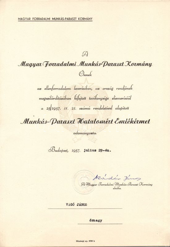 1957 Kádár János aláírása emlékérmet adományozó oklevélen https://www.darabanth.com/de/90-Fernauktion/90.0/Andere-Sammelgebiete/~778/1957-Kadar-Janos-alairasa-emlekermet-adomanyozo-oklevelen~II196932