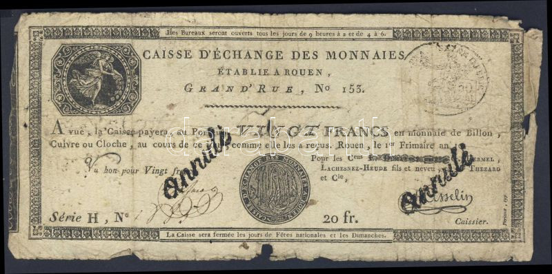 Beschreibung: Franciaország/Rouen 1797-1803. 20Fr T:IV- R!