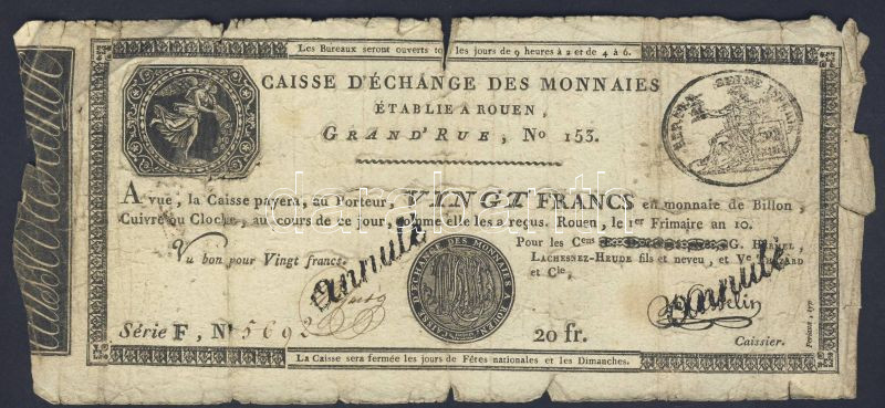 Beschreibung: Franciaország/Rouen 1797-1803. 20Fr T:IV- R!