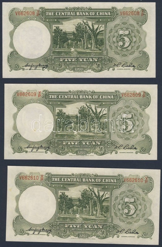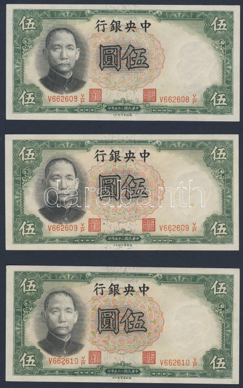 Kína/Köztársaság/Central Bank 1936. 5Y (3x) egymásutáni sorszámmal T:I https://www.darabanth.com/de/90-Fernauktion/90.0/Numismatik/~200023/KinaKoztarsasagCentral-Bank-1936-5Y-3x-egymasutani-sorszammal-TI~II197056