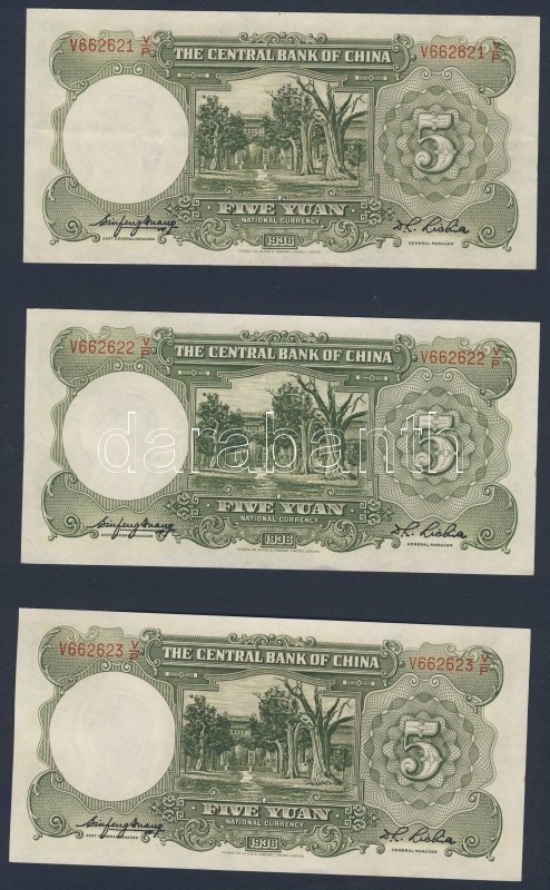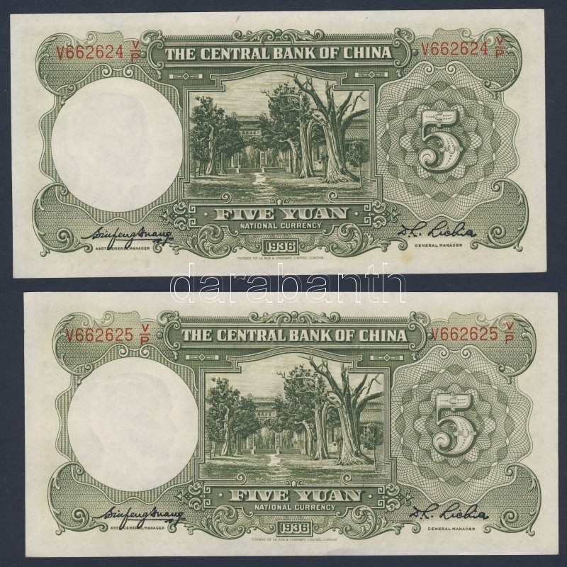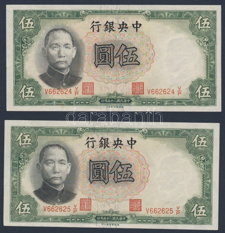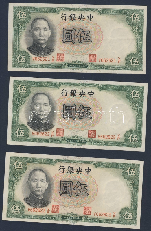 Kína/Köztársaság/Central Bank 1936. 5Y (5x) egymásutáni sorszámmal T:I https://www.darabanth.com/de/90-Fernauktion/90.0/Numismatik/~200023/KinaKoztarsasagCentral-Bank-1936-5Y-5x-egymasutani-sorszammal-TI~II197068