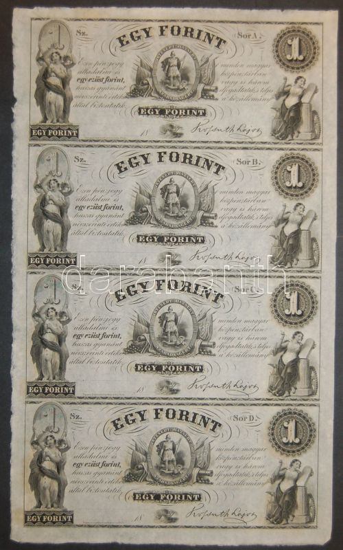 18.. Emigrációs "Kossuth bankók" 1Ft A,B,C,D összefüggő 4-es ívben T:I https://www.darabanth.com/de/90-Fernauktion/90.0/Numismatik/~200025/18-Emigracios-Kossuth-bankok-1Ft-A-B-C-D-osszefuggo-4-es-ivben-TI~II166125