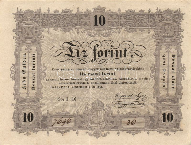 1848. 10Ft "Kossuth bankó" T:II https://www.darabanth.com/de/90-Fernauktion/90.0/Numismatik/~200025/1848-10Ft-Kossuth-banko-TII~II198564
