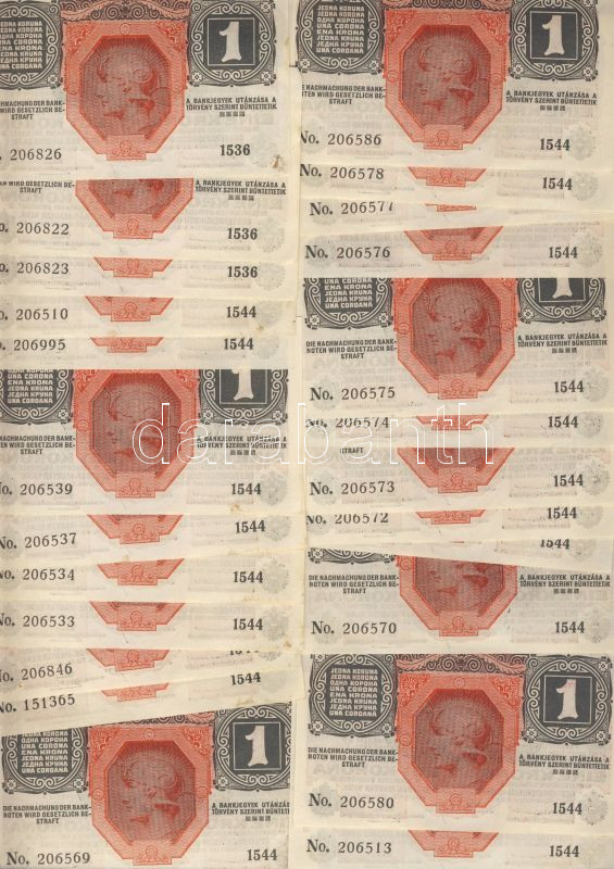 Beschreibung: 1916. 1K fekete "Deutschösterreich" fny-sal, 100 db benne igen sok egymásutáni ill. kevés ugrású sorszámokkal T:I- kis foltok, különben hajtatlan