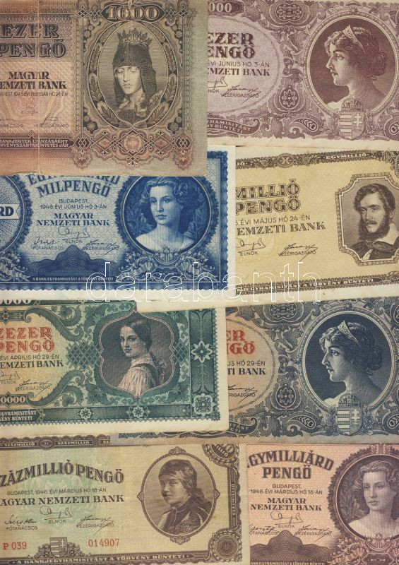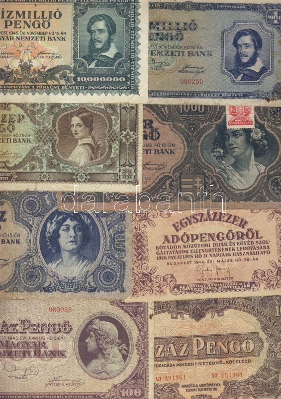 Beschreibung: Kis tétel, 38db klf bankjegy, benne korona, pengő, infla, "V.H." T:II,III,IV