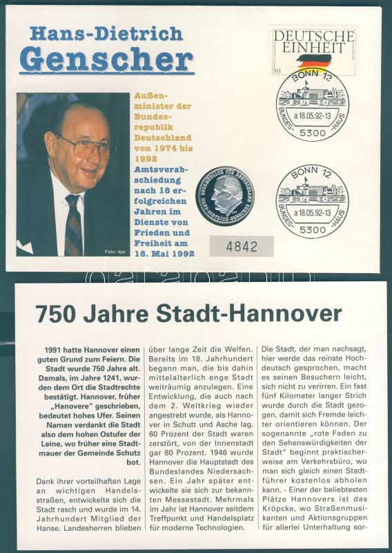 Beschreibung: NSZK 1992. "Európai Közösség-Hans-Dietrich Genscher" Ag emlékérem érmés, bélyeges borítékon T:PP Tájékoztatóval!