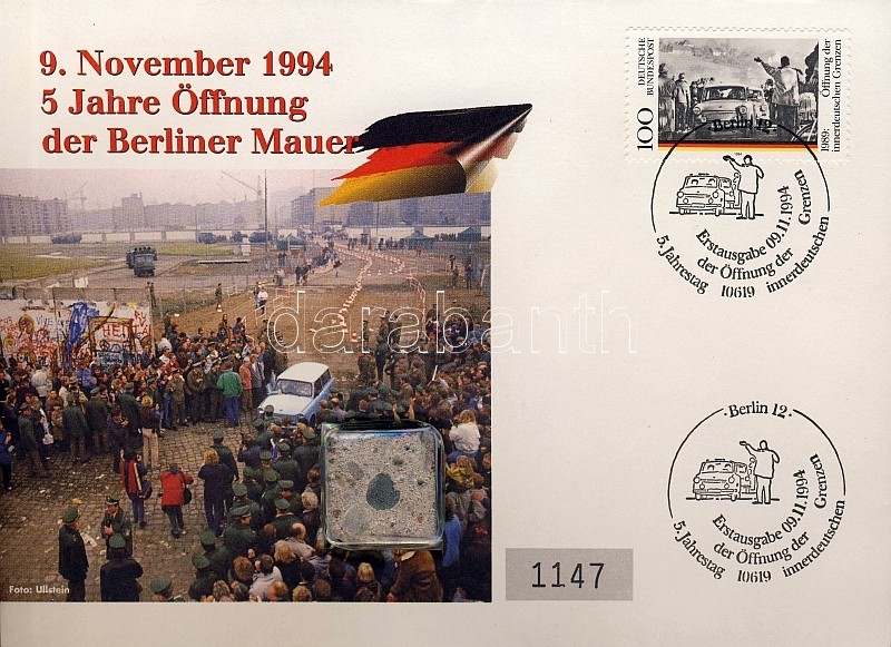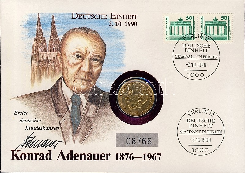 Beschreibung: Németország 1990-1994. 2db klf félbevágott 1M aranyozva (NDK+NSZK) bélyeges borítékon + 2M aranyozva "Adenauer" bélyeges borítékon + a "Berlini Fal" eredeti darabja bélyeges borítékon. Összesen 3klf db boríték ismertetőkkel!