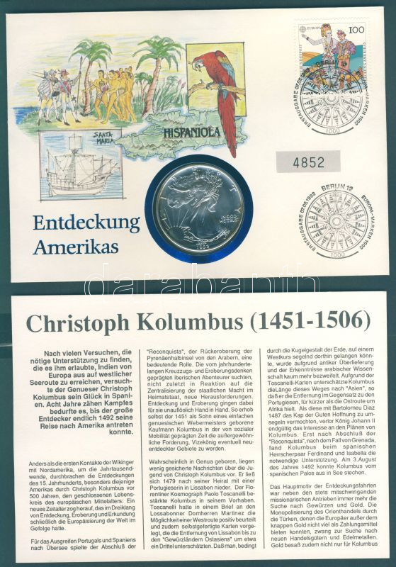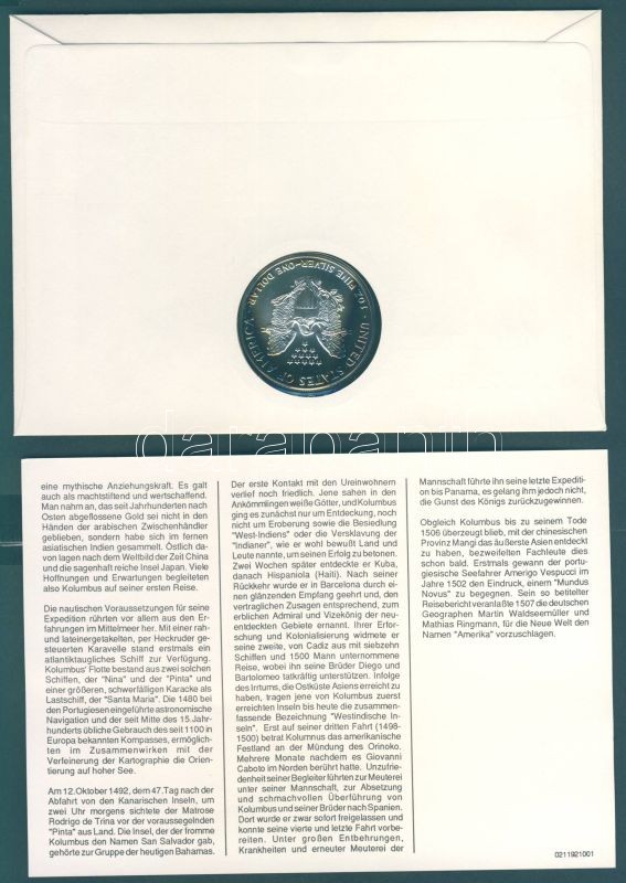 Beschreibung: USA 1992. 1$/1oz "Walking" Ag érmés borítékon "Kolumbusz" T:1 Tájékoztatóval!