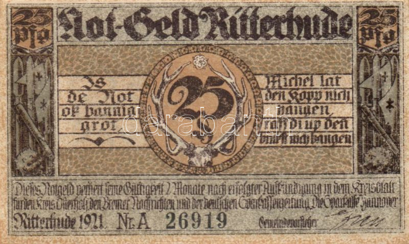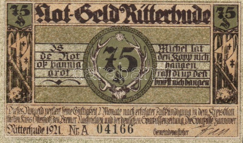 Német Birodalom/Weimari Köztársaság Ritterhude 1921. 25Pf + 50Pf + 75P... https://www.darabanth.com/de/90-Fernauktion/90.0/Numismatik/~200037/Nemet-BirodalomWeimari-Koztarsasag-Ritterhude-1921-25Pf-plus-50Pf-plus-75Pf-3-klf-teljes-sor-TI~II199148
