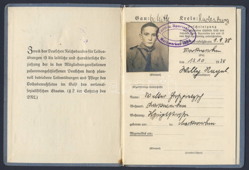 Beschreibung: Német 3. Birodalom 1938. "Német Torna- és Sportünnepélyek" nagyalakú fém kitűző, fényképes sportigazolvánnyal T:2