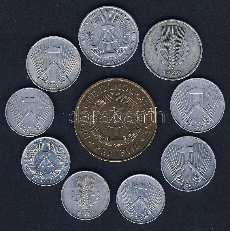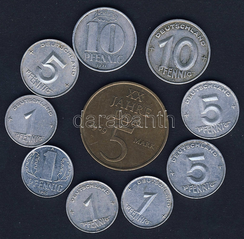 NDK 1949-69. 1Pf (4x), 5Pf (3x), 10Pf (2x), 5M "20 éves az NDK" T:2,3 https://www.darabanth.com/de/90-Fernauktion/90.0/Numismatik/~200041/NDK-1949-69-1Pf-4x-5Pf-3x-10Pf-2x-5M-20-eves-az-NDK-T2-3~II198910