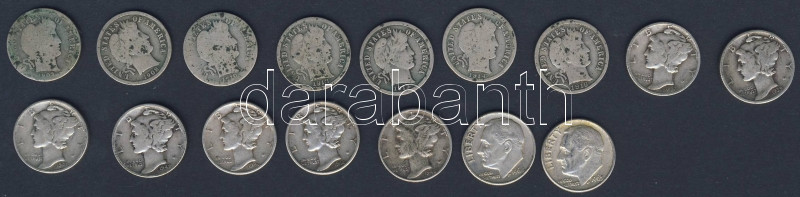 USA 1903-64. 10c Ag "Barber" (7x) + "Mercury" (7x) + "Roosevelt" (2x) ... https://www.darabanth.com/de/90-Fernauktion/90.0/Numismatik/~200041/USA-1903-64-10c-Ag-Barber-7x-plus-Mercury-7x-plus-Roosevelt-2x-T2-3-34-4-Osszesen-16db-Mi~II197394