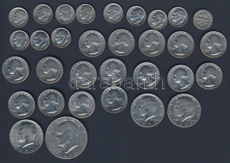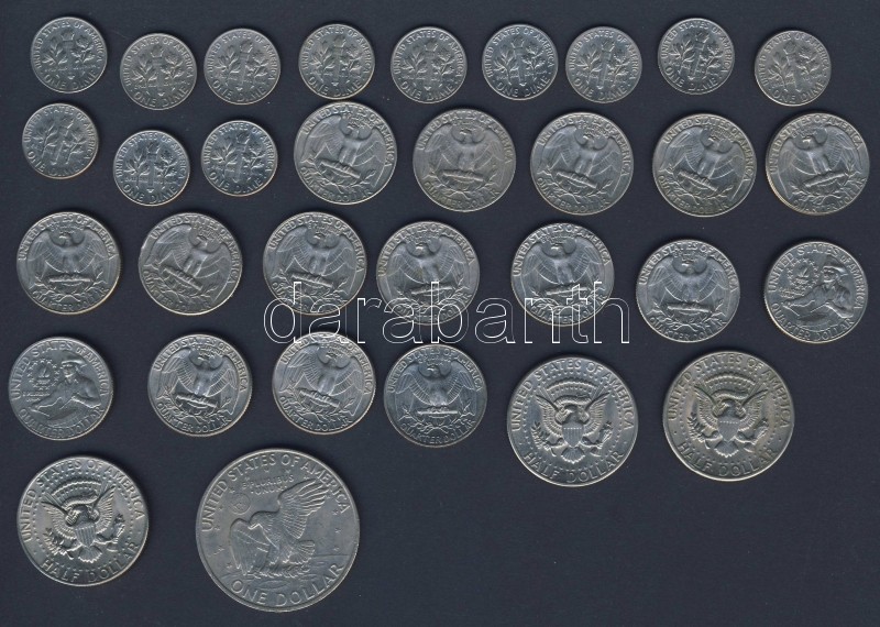 Beschreibung: USA 1965-80. 10c "Roosevelt" (12x), 1/4$ "Washington" (16x), 1/2$ "Kennedy" (3x), 1$ "Eisenhower" (1x) beváltható nominál! T:2,2/3,3