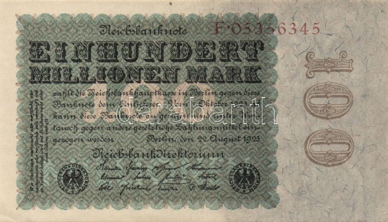 Beschreibung: Német Birodalom/Weimari Köztársaság 1923. 100.000.000M Birodalmi nyomat jobb oldali vízjellel T:I-