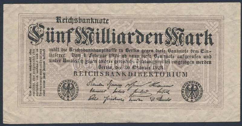 Német Birodalom/Weimari Köztársaság 1923. 5000.000.000M igen látványos lemezhibákkal, többek között törött "R" hiányzó szárú "N", hiányos "D" és még sok más T:II-