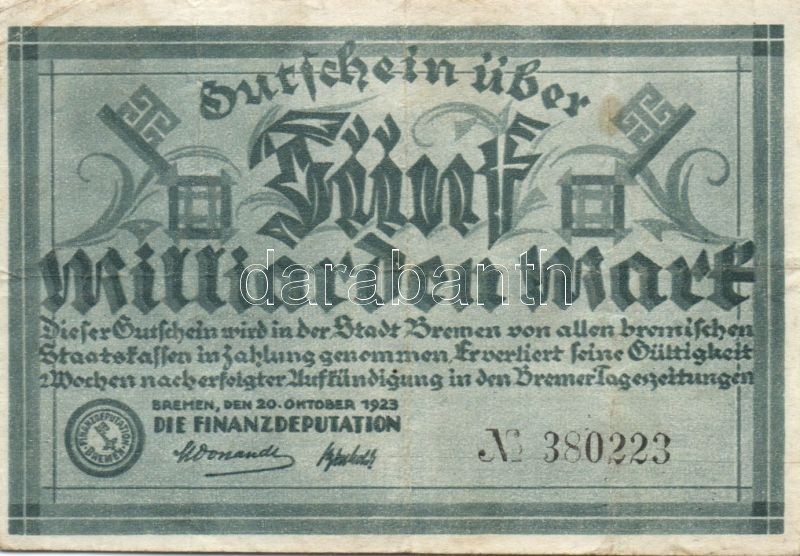 Beschreibung: Német Birodalom/Weimari Köztársaság/Bréma/Finanzdeputation 1923. 5000000M T:II-
