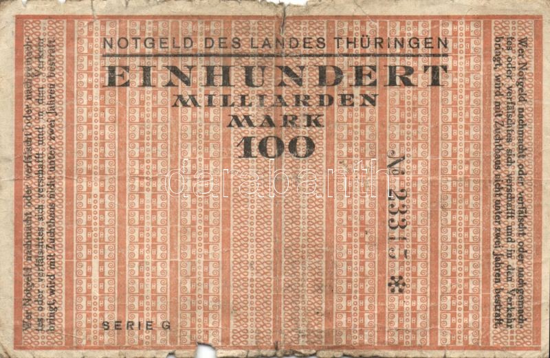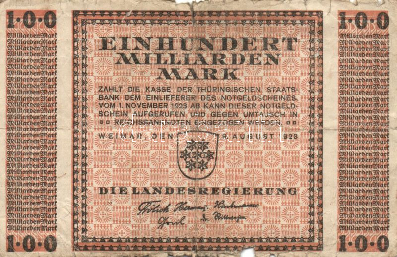 Német Birodalom/Weimari Köztársaság/Thüringen/Landesregierung Weimar 1... https://www.darabanth.com/de/90-Fernauktion/90.0/Numismatik/~200045/Nemet-BirodalomWeimari-KoztarsasagThuringenLandesregierung-Weimar-1923-100000000000M-TIV-R~II197257