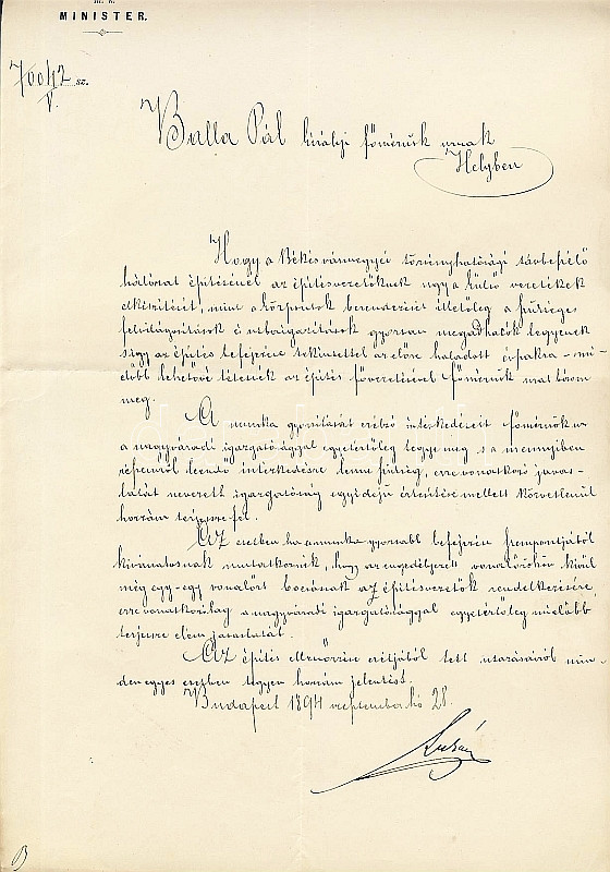 Beschreibung: 1894 Lukács Béla kereskedelemügyi miniszter aláírása levélen