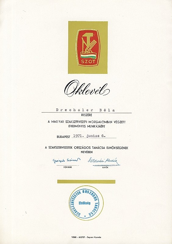 Beschreibung: 1968 Oláh János földművelésügyi miniszter aláírása oklevélen + 1971 Gáspár Sándor SZOT elnök aláírása oklevélen