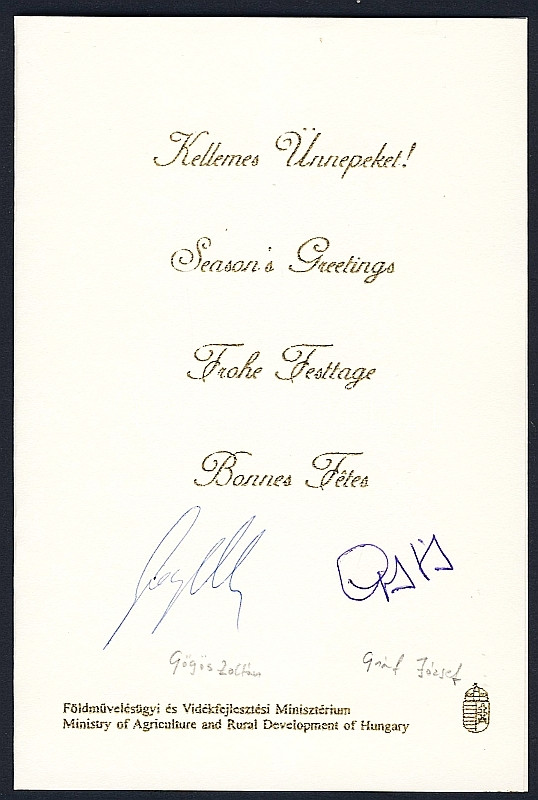 Beschreibung: Gráf József földművelésügyi miniszter aláírása üdvözlő kártyán
