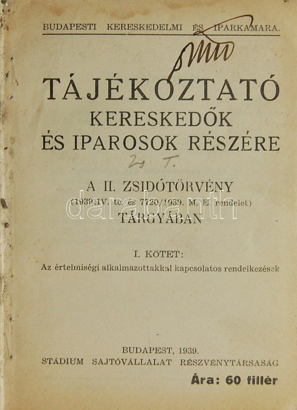 1939 A Budapesti Kereskedelmi és Iparkamara tájékoztatója a II. Zsidót... https://www.darabanth.com/de/91-Fernauktion/91.0/Andere-Sammelgebiete/~15115/1939-A-Budapesti-Kereskedelmi-es-Iparkamara-tajekoztatoja-a-II-Zsidotorveny-targyaban~II203346