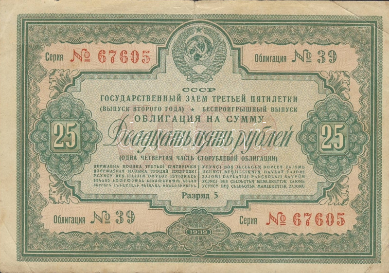 Beschreibung: Szovjetunió 1939. III. ötéves terv békekölcsön 25R, pénz helyett is használható volt! T:III+