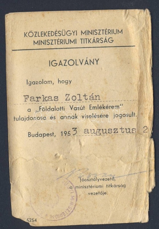 1953. "Földalatti Vasút Emlékérem" zománcozott érdemérem, névreszóló e... https://www.darabanth.com/de/91-Fernauktion/91.0/Numismatik/~15164/1953-Foldalatti-Vasut-Emlekerem-zomancozott-erdemerem-nevreszolo-eredeti-igazolvannya~II200943