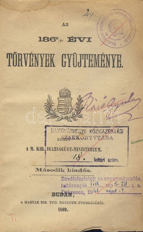 1869 1865-1867. évi törvények gyűjteménye. Benne a kiegyezés teljes sz... https://www.darabanth.com/de/92-Fernauktion/92.0/Andere-Sammelgebiete/~289/1869-1865-1867-evi-torvenyek-gyujtemenye-Benne-a-kiegyezes-teljes-szovege-gerinc-serult~II205494