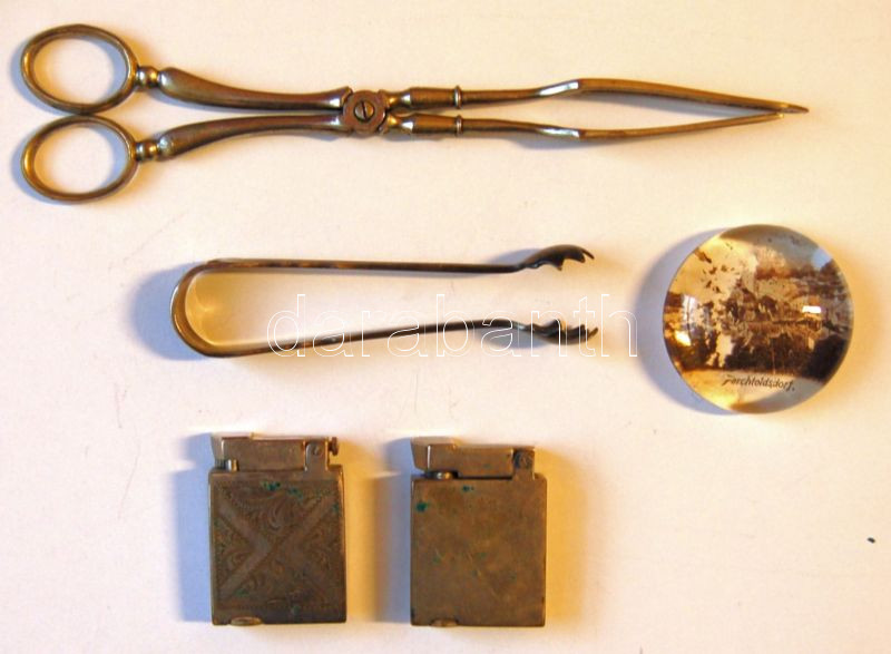 Beschreibung: Kis vegyes tétel: 2 db régi benzines öngyújtó, süteménykiszedő, cukorfogó, Perchtoldsdorf üvegfotó