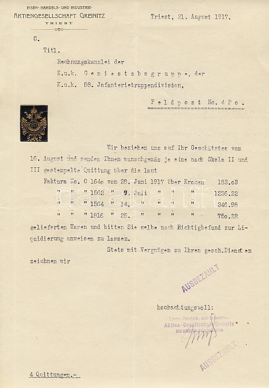 1889- 1917 9 db számla hadi szállításokról szép katonai pecsétekkel és... https://www.darabanth.com/de/92-Fernauktion/92.0/Andere-Sammelgebiete/~309/1889-1917-9-db-szamla-hadi-szallitasokrol-szep-katonai-pecsetekkel-es-cimkekkel~II197648