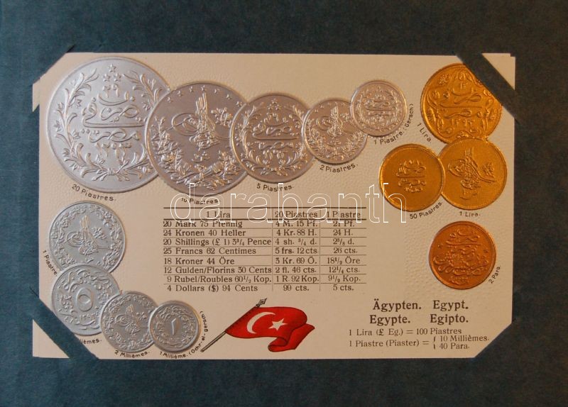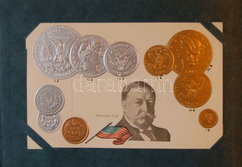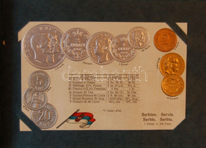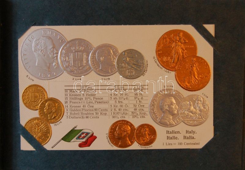 1916 A világ pénzei: 44 dombornyomott litho lap a világ országainak fémpénzeivel, zászlójával szép albumban / 44 embossed litho cars in nice album with the flags and coins of the world