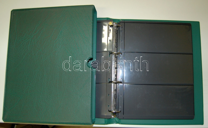 Beschreibung: Leuchtturm gyűrűs berakó, 24db barakólappal, ebből 22db 3-as osztású, 2db 2-s osztású, így összesen 140 férőhellyel! Tokkal, zöld színben, újszerű állapotban!