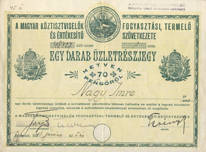 Beschreibung: 1941. "A Magyar Köztisztviselők Fogyasztási, Termelő és Értékesítő Szövetkezete" üzletrészjegy 70P-ről, szelvényekkel
