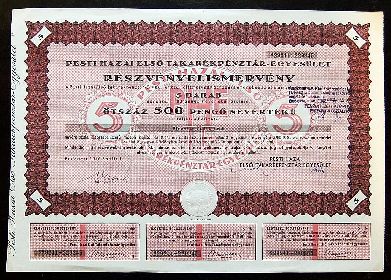 1946. "Pesti Hazai Első Takarékpénztár-Egyesület" részvényelismervénye... https://www.darabanth.com/de/92-Fernauktion/92.0/Numismatik/~293/1946-Pesti-Hazai-Elso-Takarekpenztar-Egyesulet-reszvenyelismervenye-500P-rol~II205890