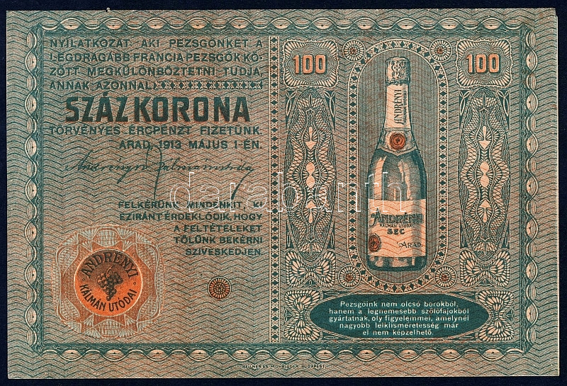 Beschreibung: 1913. 100K dekoratív bankjegyszerű pezsgőreklám imitációja T:II+
