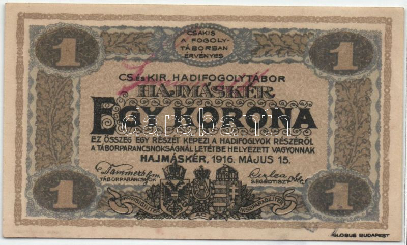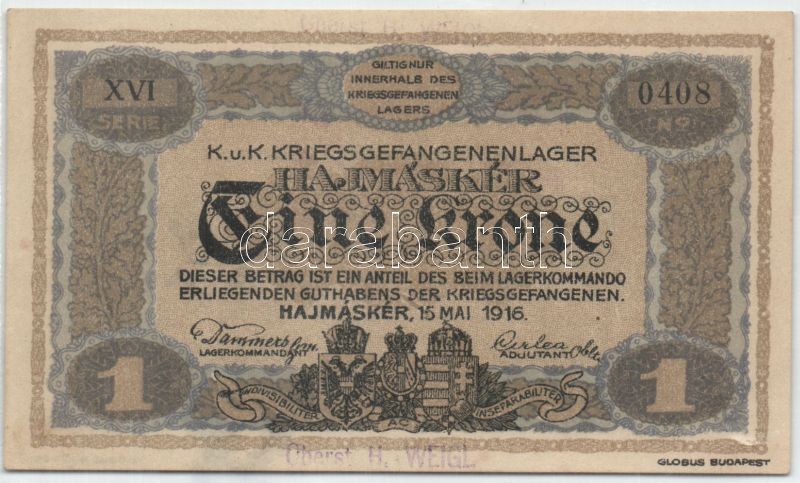Hajmáskér/hadifogolytábor II.kiadás 1920. 1K római sorozat és arab számozás + Oberst H. Weigl lila felülbélyegzés + magyar oldalon aláírás a bankjegyen! Ezt a változatot Adamovszky nem említi! T:I R!