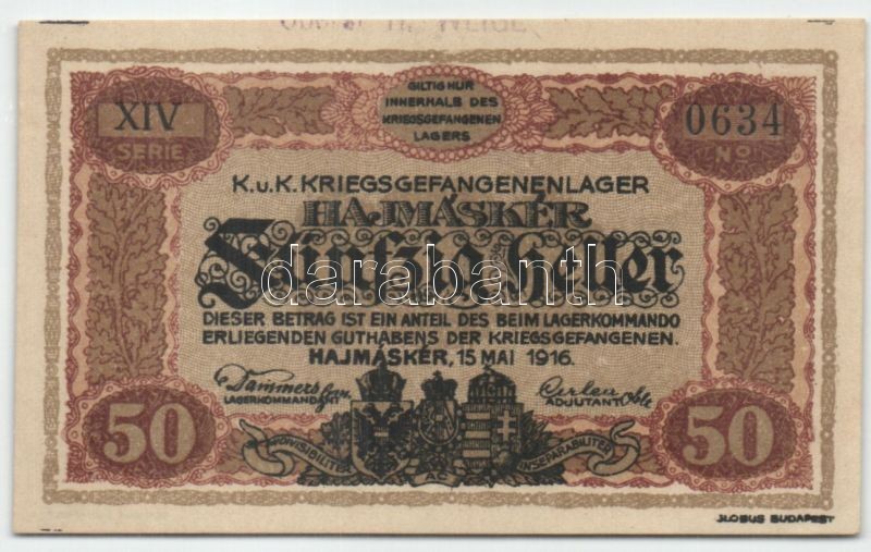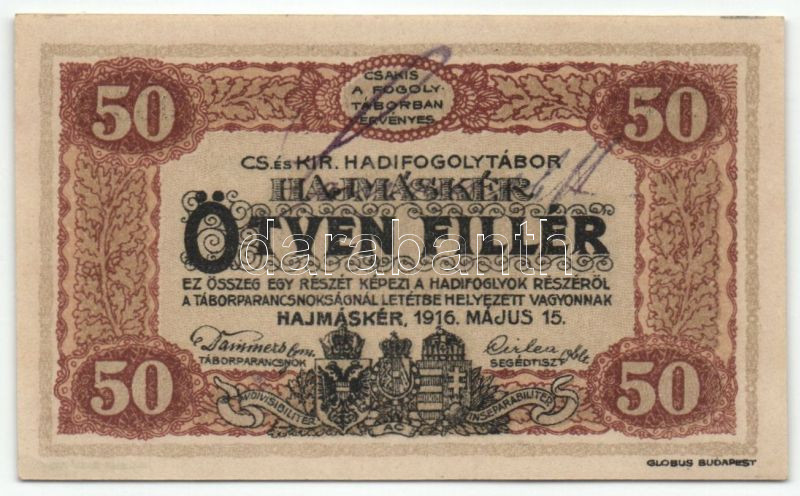 Hajmáskér/hadifogolytábor II.kiadás 1920. 50f római sorozat és arab számozás + Oberst H. Weigl lila felülbélyegzés + magyar oldalon aláírás a bankjegyen! T:I R!
