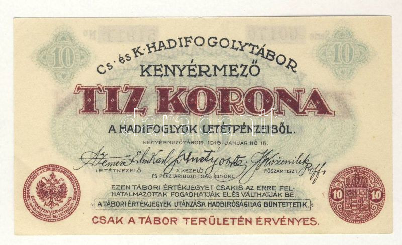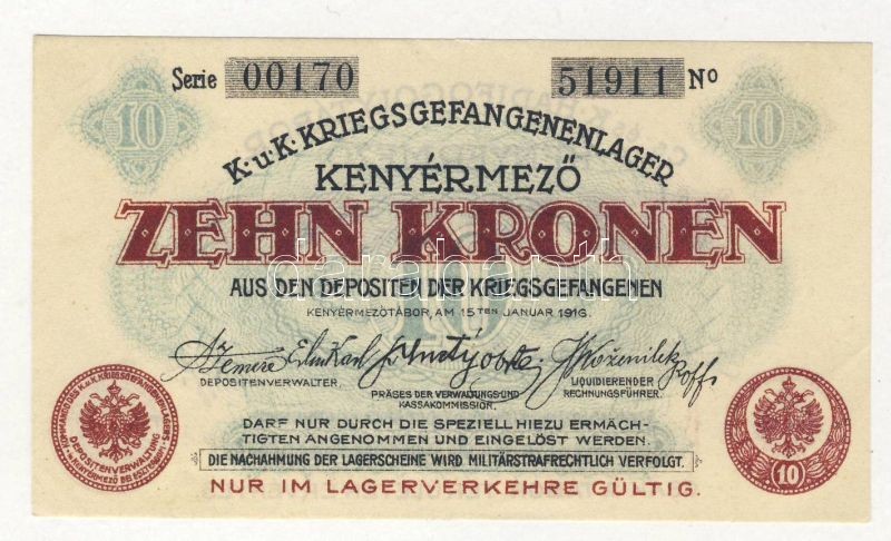 Kenyérmező/hadifogolytábor 1916. 10K T:I https://www.darabanth.com/de/92-Fernauktion/92.0/Numismatik/~294/Kenyermezohadifogolytabor-1916-10K-TI~II207327