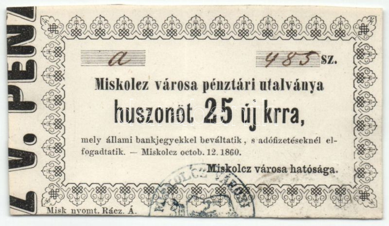 Beschreibung: Miskolc 1860. 25kr T:I