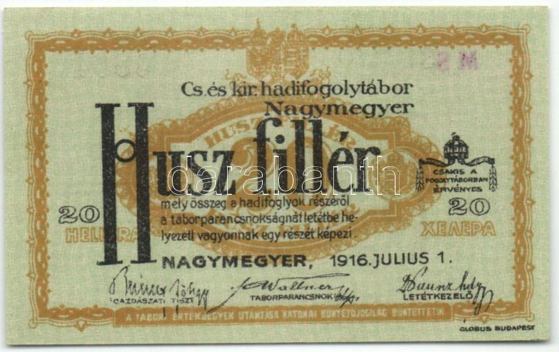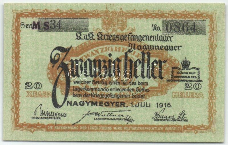 Nagymegyer/hadifogolytábor 1916. 20f "MS"(Museum Serie) T:I https://www.darabanth.com/de/92-Fernauktion/92.0/Numismatik/~294/Nagymegyerhadifogolytabor-1916-20f-MSMuseum-Serie-TI~II207331