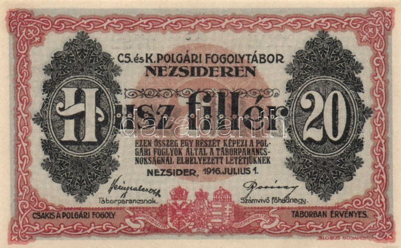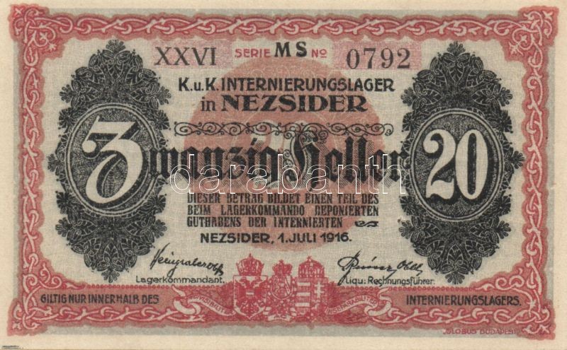 Nezsider/hadifogolytábor 1916. 20f T:I https://www.darabanth.com/de/92-Fernauktion/92.0/Numismatik/~294/Nezsiderhadifogolytabor-1916-20f-TI~II207345