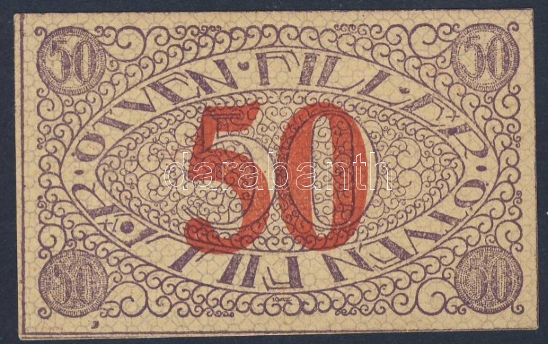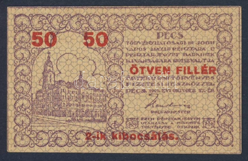 Pécs 1919. pénztárjegy 50f II.kiadás T:I https://www.darabanth.com/de/92-Fernauktion/92.0/Numismatik/~294/Pecs-1919-penztarjegy-50f-IIkiadas-TI~II207305