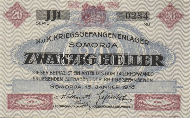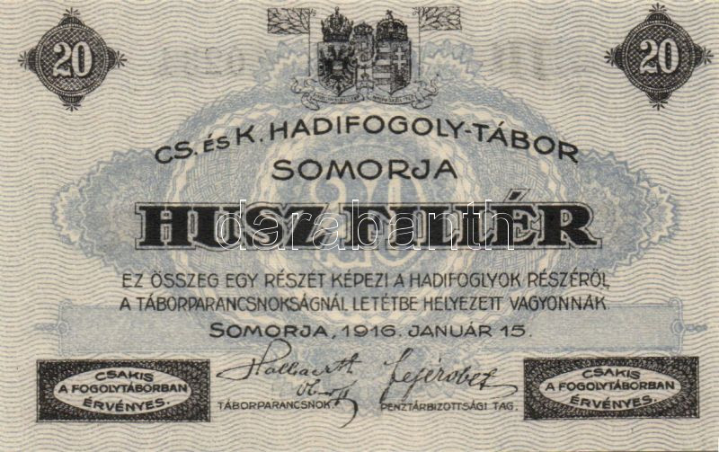 Somorja/hadifogolytábor 1916. 20f T:I https://www.darabanth.com/de/92-Fernauktion/92.0/Numismatik/~294/Somorjahadifogolytabor-1916-20f-TI~II207321