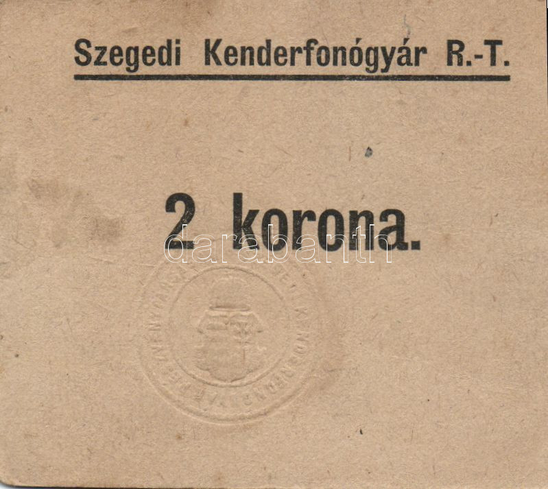 Szeged/Szegedi Kenderfonógyár Rt. DN 2K szárazbélyegzővel T:II pici fo... https://www.darabanth.com/de/92-Fernauktion/92.0/Numismatik/~294/SzegedSzegedi-Kenderfonogyar-Rt-DN-2K-szarazbelyegzovel-TII-pici-folttal~II207624