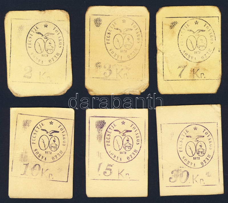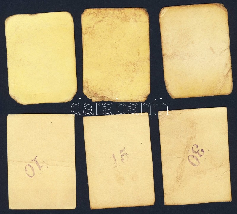 Beschreibung: Tóváros DN 2kr, 3kr, 7kr, 10kr, 15kr, 30kr vastag kartonpapíron, 10kr + 30kr hátoldali 10, ill. 30 bélyegzővel. Csinálmány?! Adamovszky nem említi! T:II,III