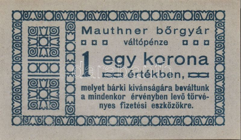 Újpest/Mauthner bőrgyár 1919. 1K T:I https://www.darabanth.com/de/92-Fernauktion/92.0/Numismatik/~294/UjpestMauthner-borgyar-1919-1K-TI~II207298