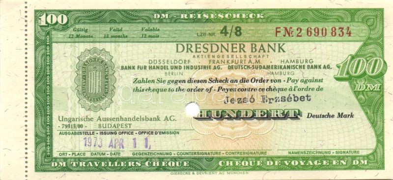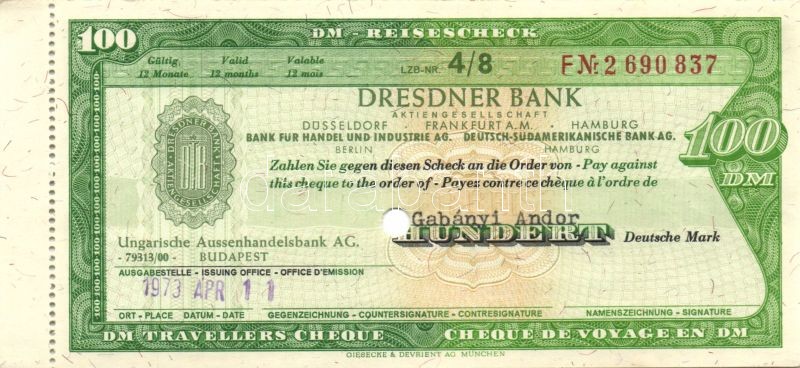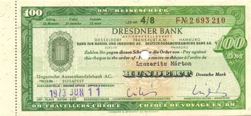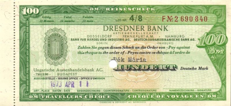 NSZK 1973. 100DM utazási csekk "Magyar Külkereskedelmi Bank" által kiá... https://www.darabanth.com/de/92-Fernauktion/92.0/Numismatik/~295/NSZK-1973-100DM-utazasi-csekk-Magyar-Kulkereskedelmi-Bank-altal-kiallitva-10x-egymasutan~II207084