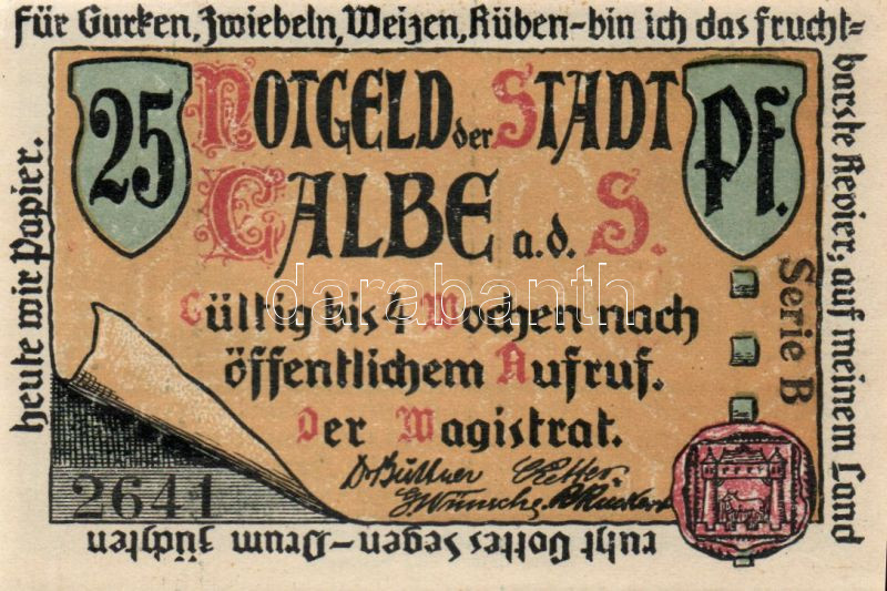 Német Birodalom/Weimari Köztársaság Calbe 1921. 25 Pf + 50 Pf + 75 Pf ... https://www.darabanth.com/de/92-Fernauktion/92.0/Numismatik/~295/Nemet-BirodalomWeimari-Koztarsasag-Calbe-1921-25-Pf-plus-50-Pf-plus-75-Pf-plus-1M--4-klf-teljes-sor-T~II205385