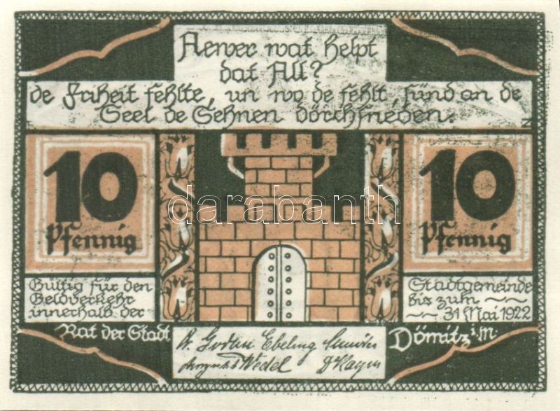 Német Birodalom/Weimari Köztársaság/ Dömitz 1922. 10Pf + 25Pf + 50Pf 3... https://www.darabanth.com/de/92-Fernauktion/92.0/Numismatik/~295/Nemet-BirodalomWeimari-Koztarsasag-Domitz-1922-10Pf-plus-25Pf-plus-50Pf-3klf-db-teljes-sor-TI~II206500