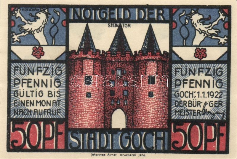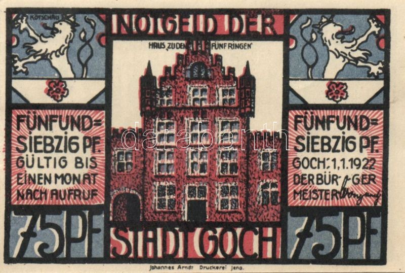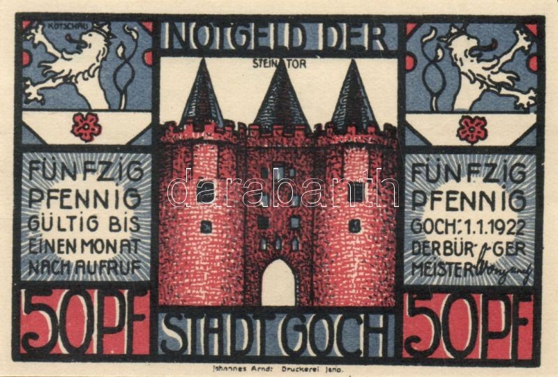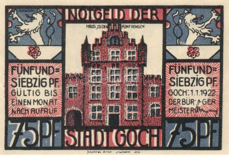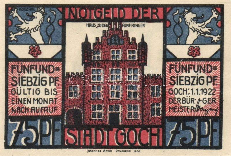 Német Birodalom/Weimari Köztársaság/ Goch 1922. 50Pf(2x) + 75Pf(4x) ös... https://www.darabanth.com/de/92-Fernauktion/92.0/Numismatik/~295/Nemet-BirodalomWeimari-Koztarsasag-Goch-1922-50Pf2x-plus-75Pf4x-osszesen-6klf-db-teljes-so~II206706